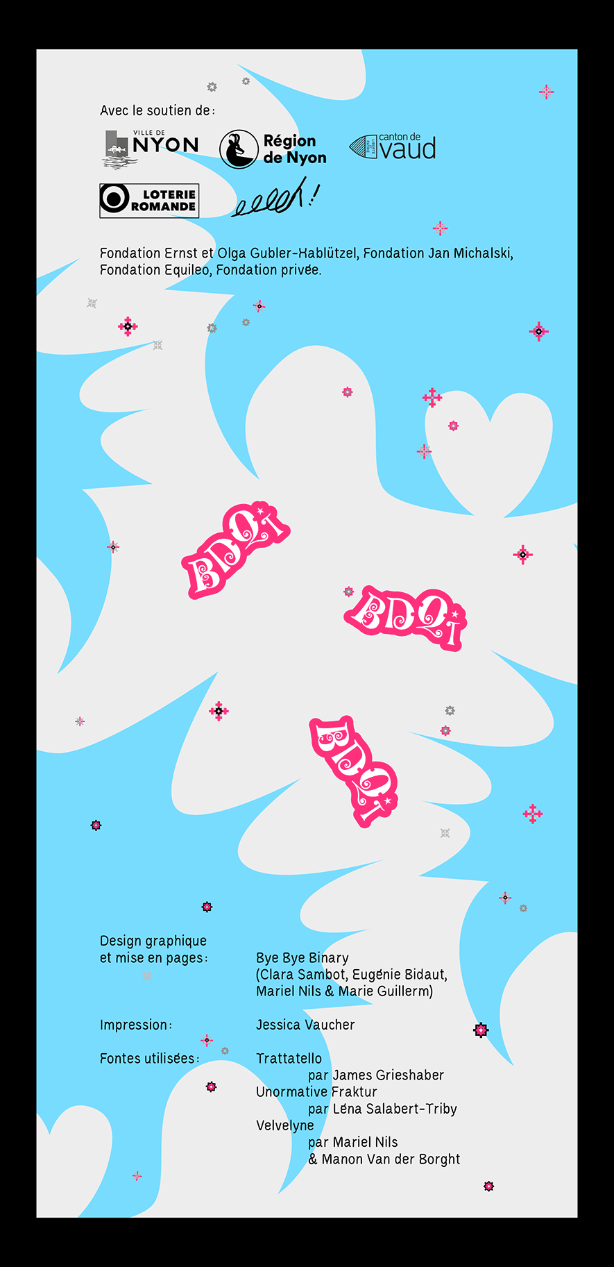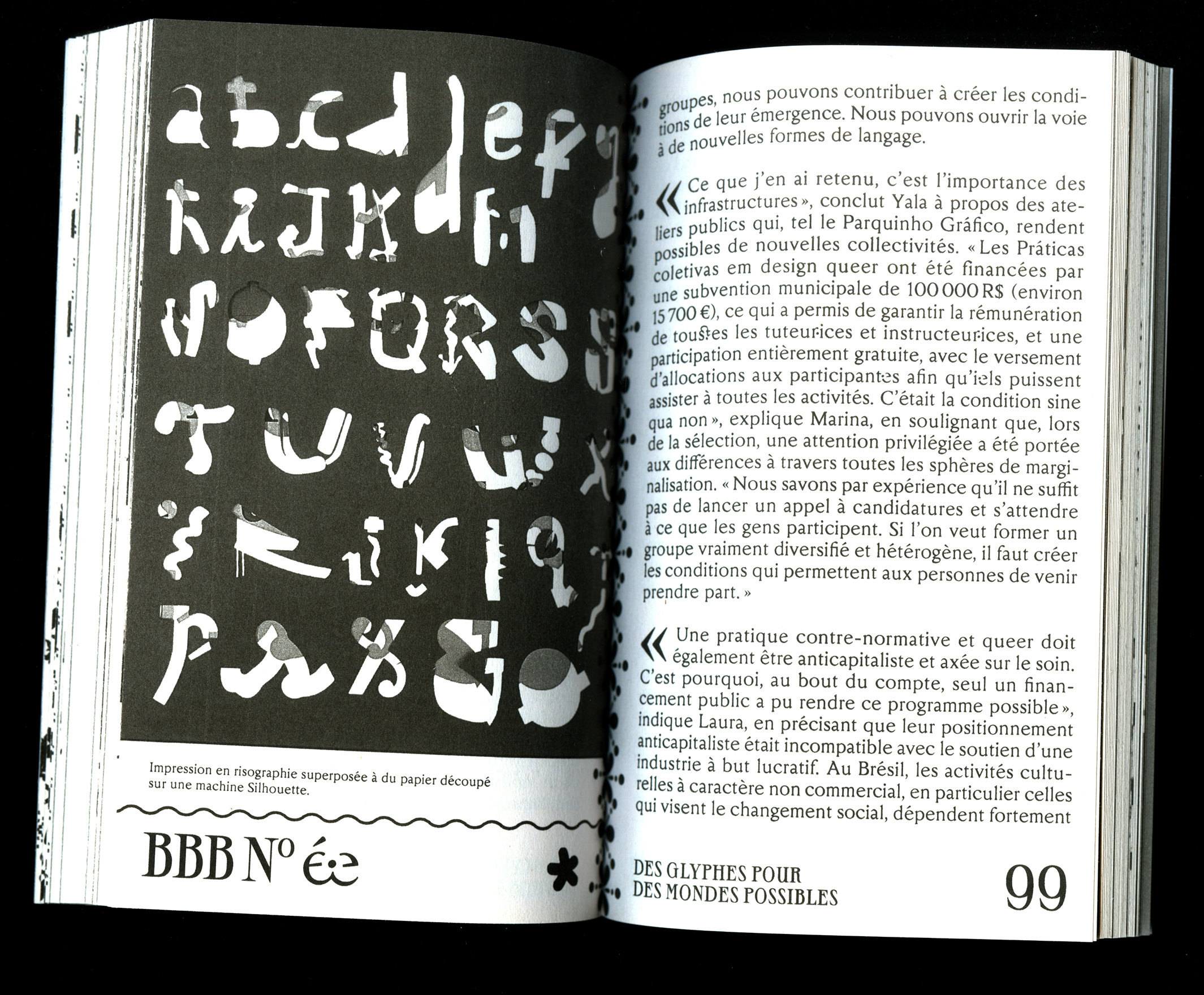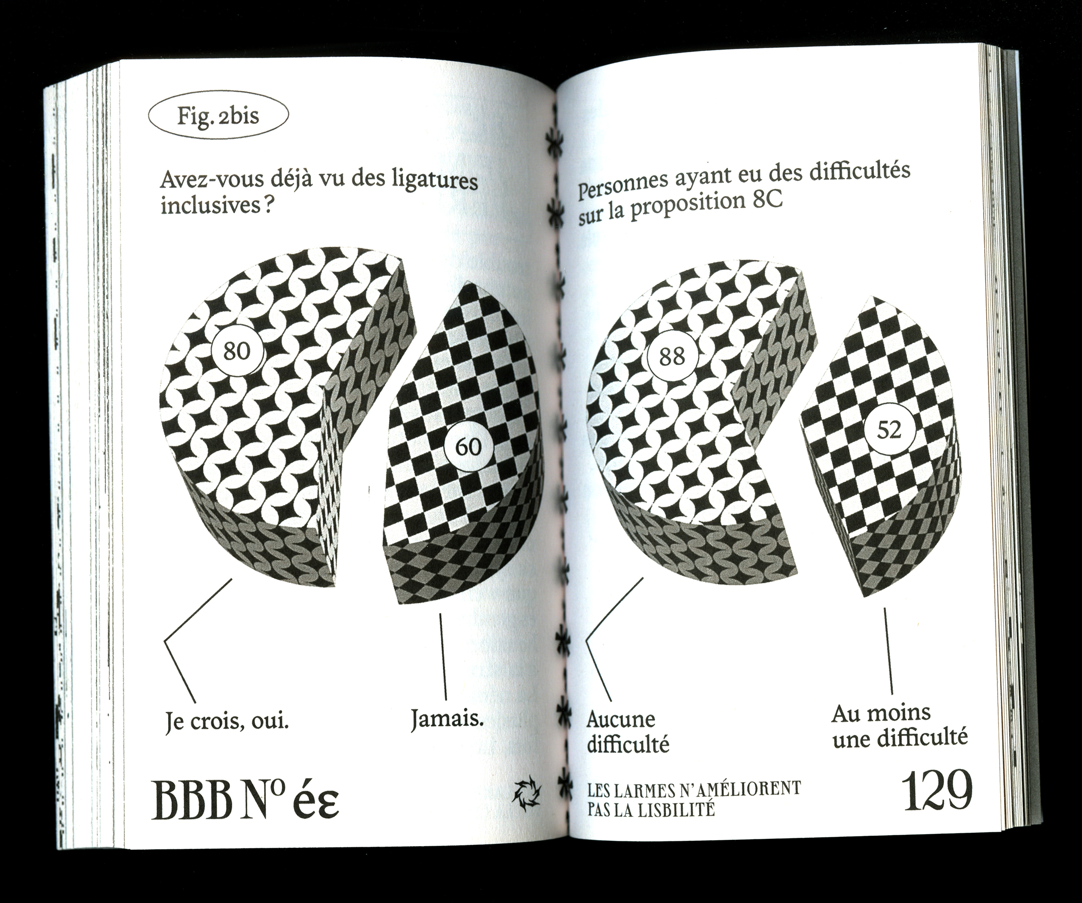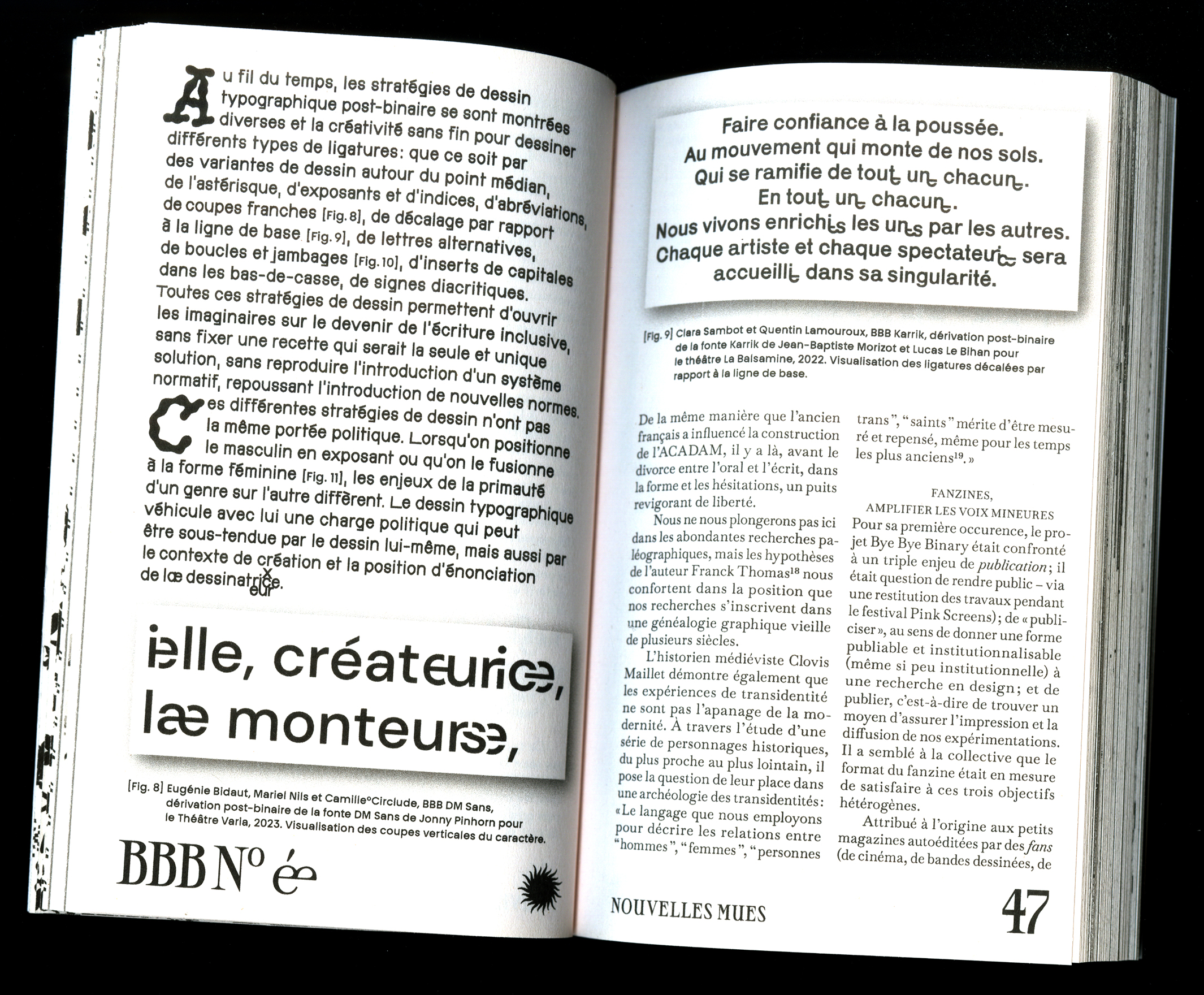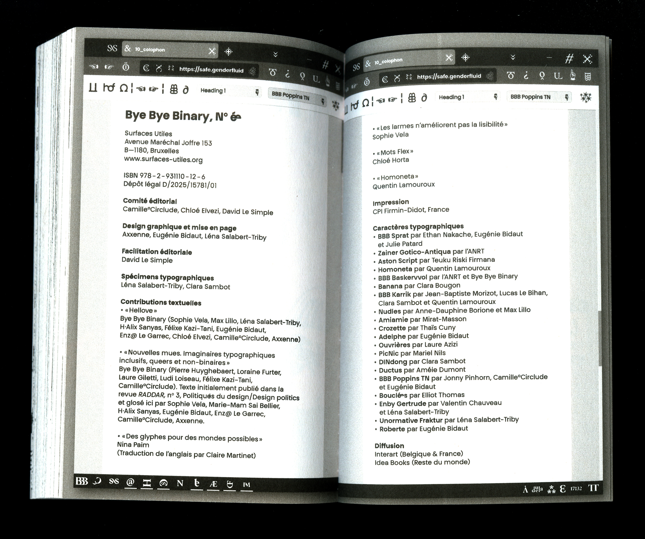 Bye Bye Binary, elle mène une recherche pratique et théorique sur le dessin de caractères en tant qu’outil de démasculinisation et de débinarisation de la langue française et participe à la création de diverses fontes post‑binaires.