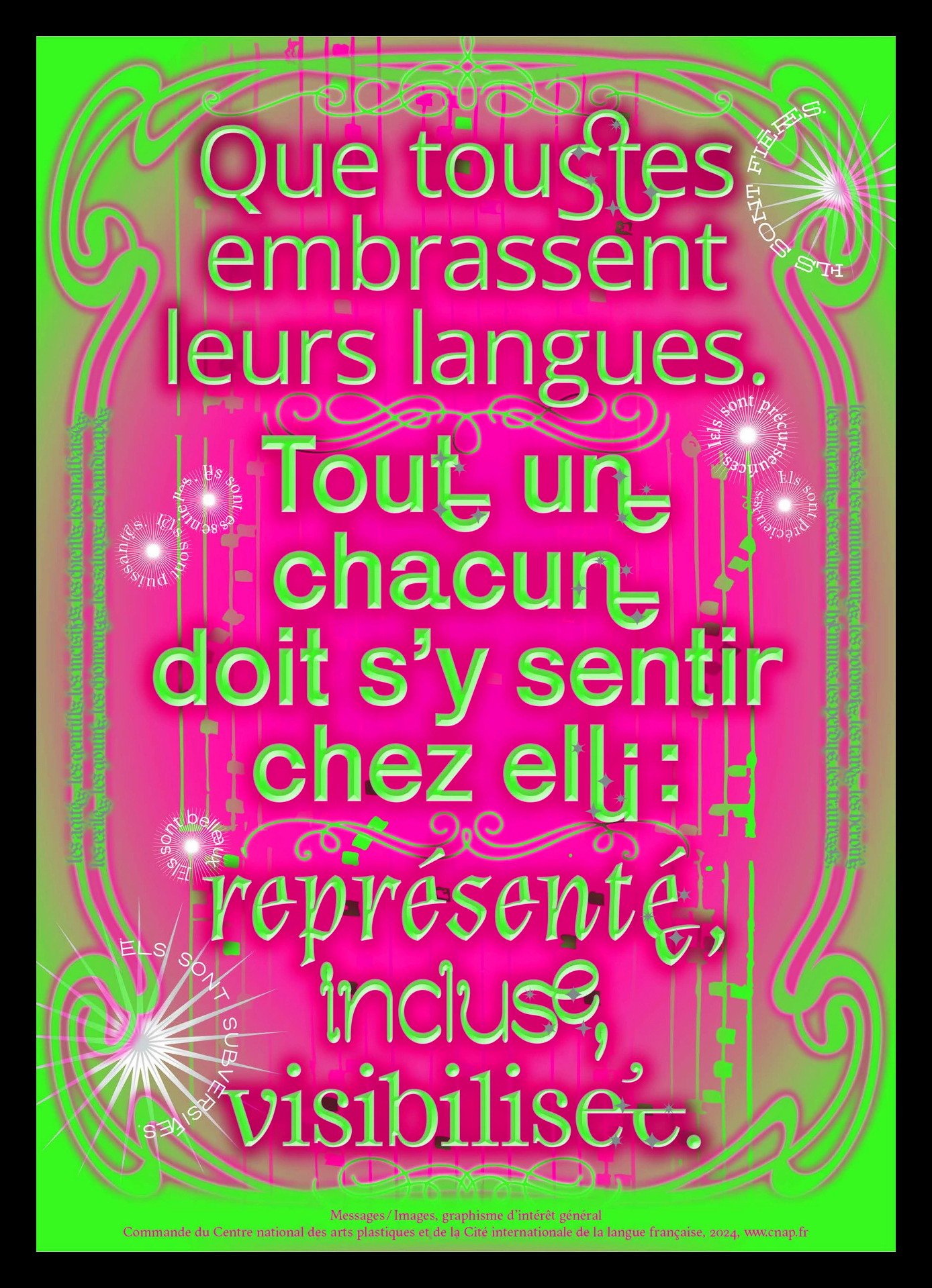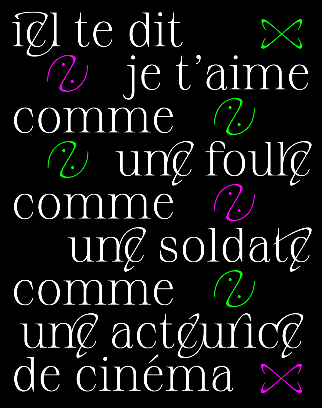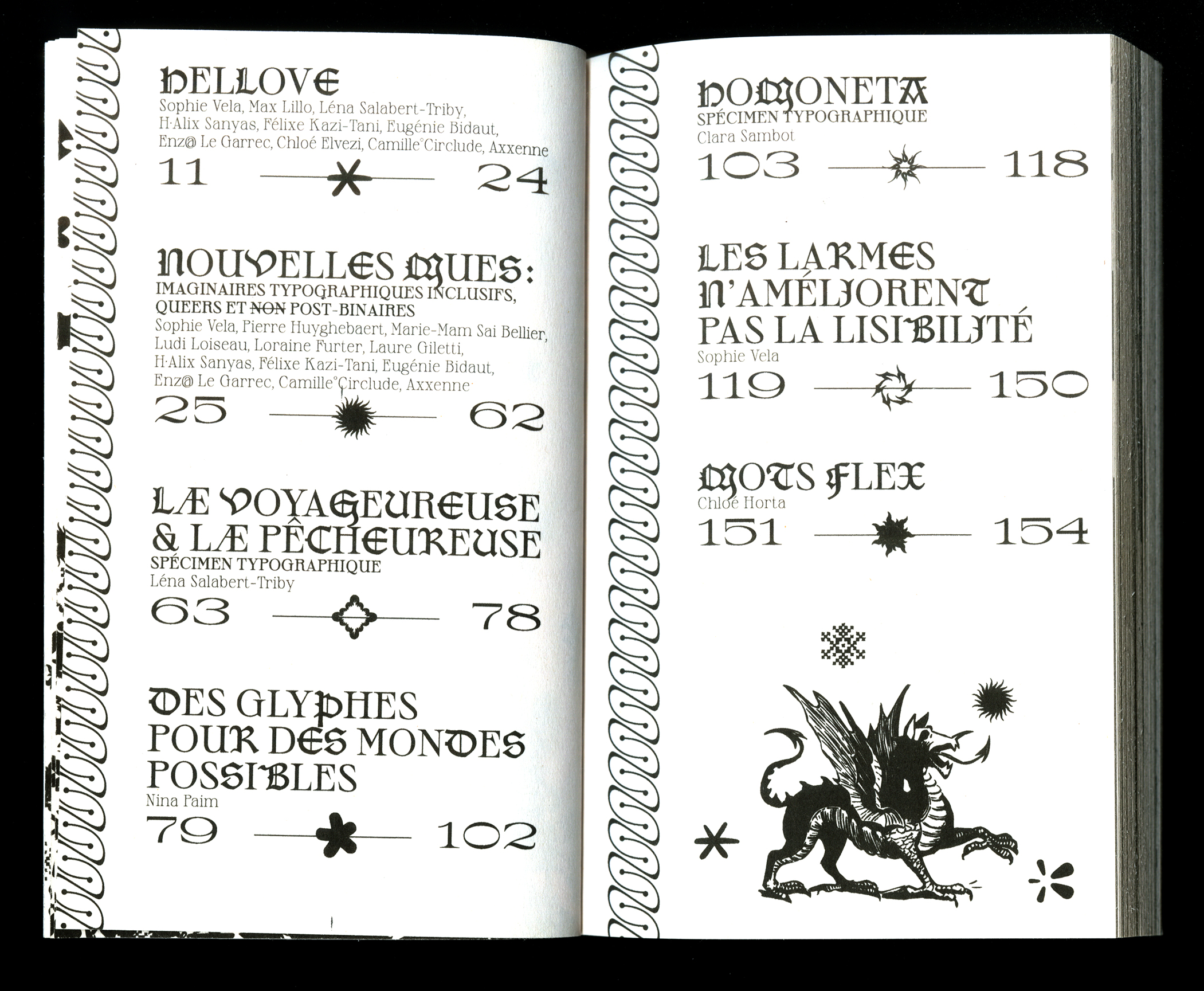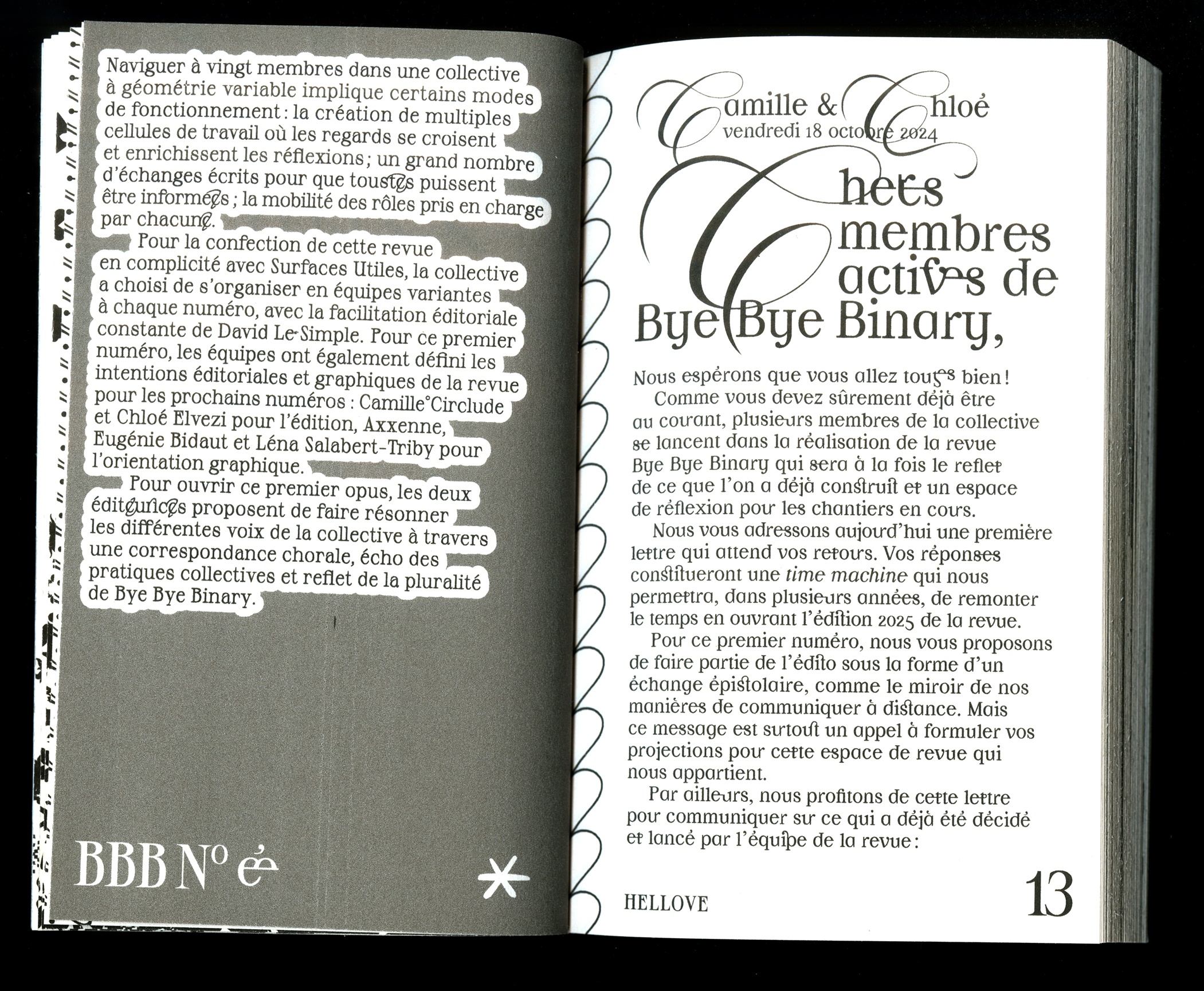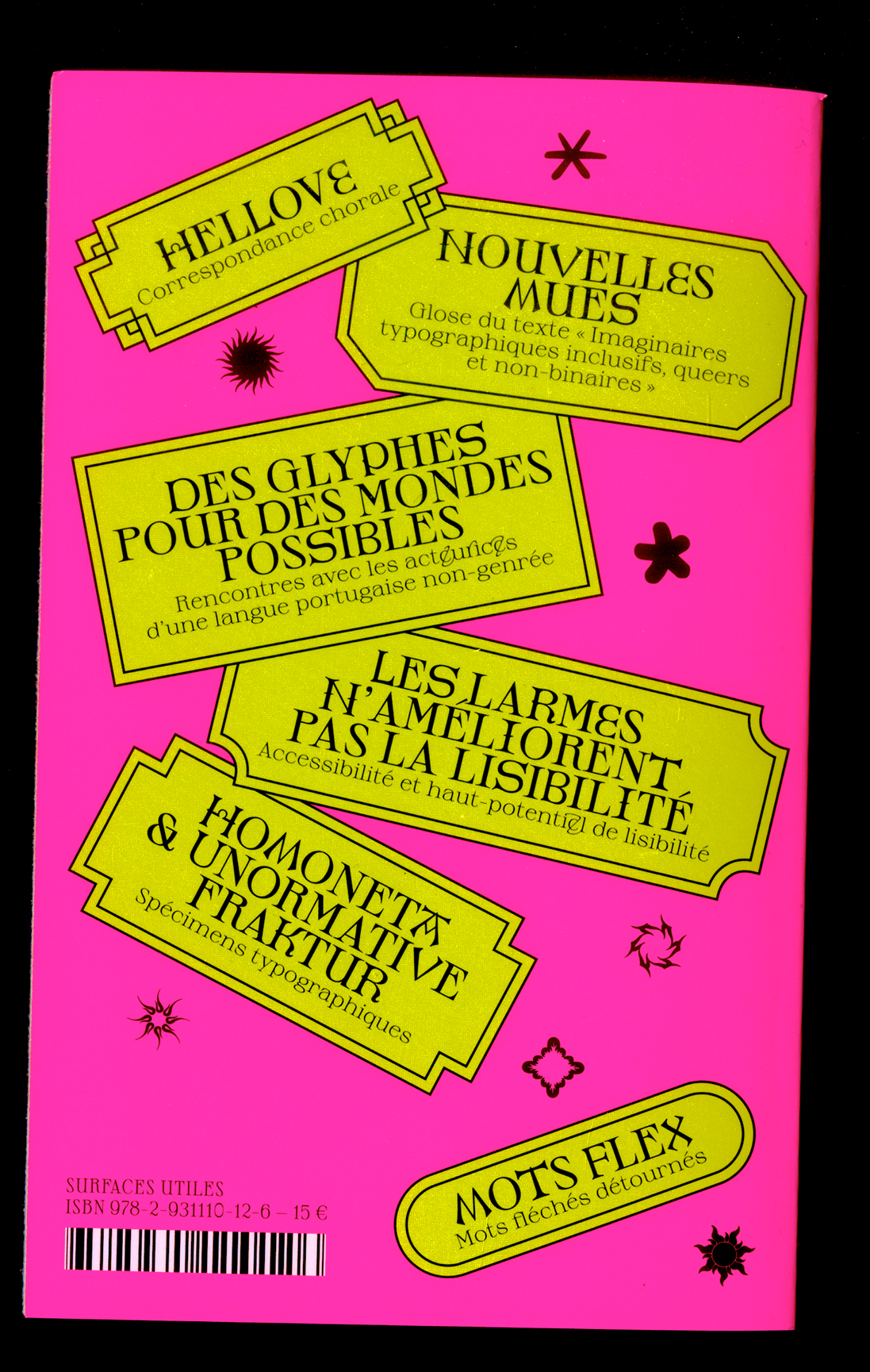 Bye Bye Binary, elle mène une recherche pratique et théorique sur le dessin de caractères en tant qu’outil de démasculinisation et de débinarisation de la langue française et participe à la création de diverses fontes post‑binaires.