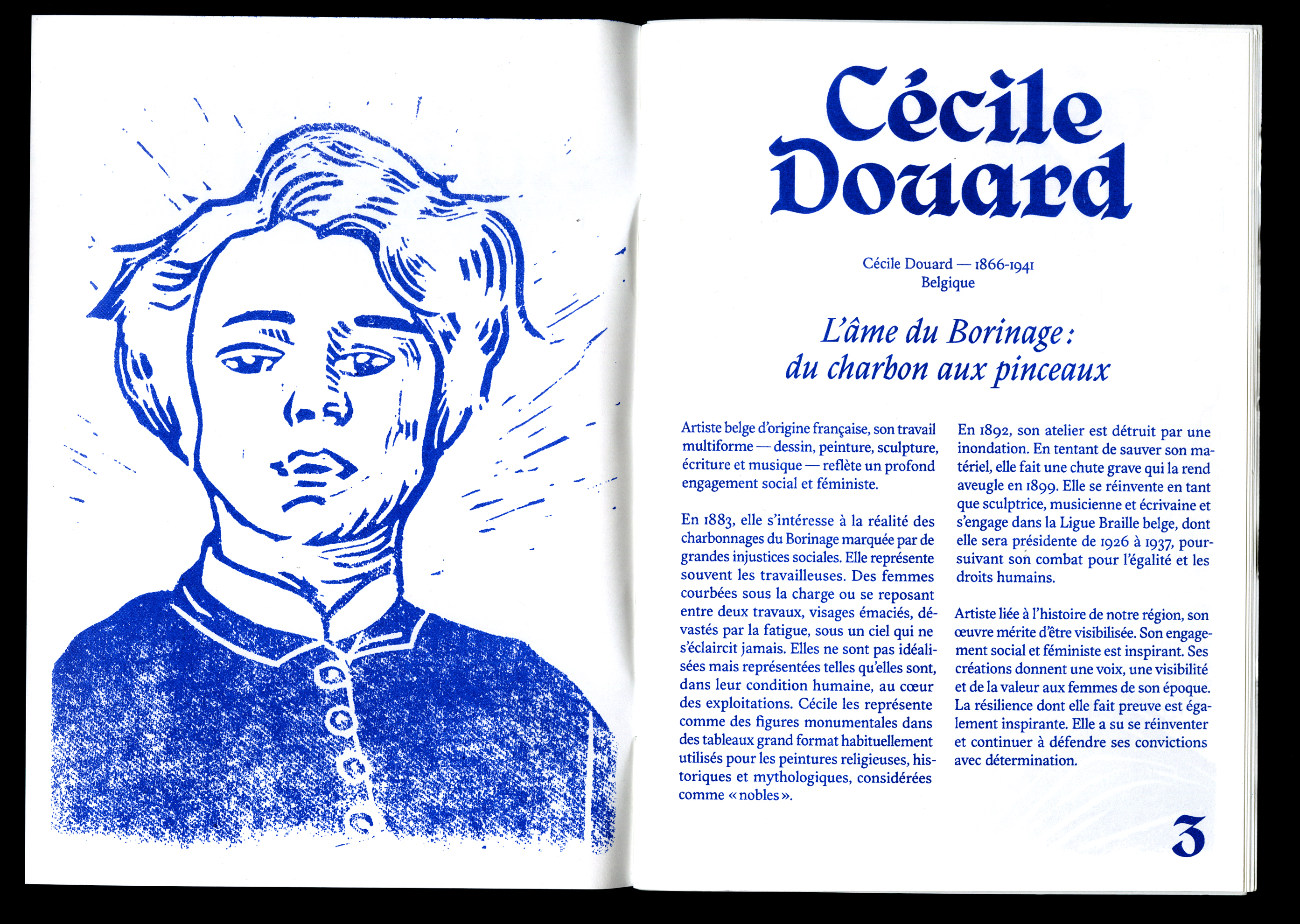 Atelier National de Recherche Typographique (Nancy) en 2022, elle travaille principalement pour et avec des structures culturelles et des organisations militantes. Désormais installée à Bruxelles, elle travaille en freelance sur des projets de dessin de caractères, de conception d’identités visuelles, de design éditorial et de développement web. Elle collabore fréquemment avec d’autres graphistes belges et français·es. Elle enseigne le dessin de caractères et la typographie à l’